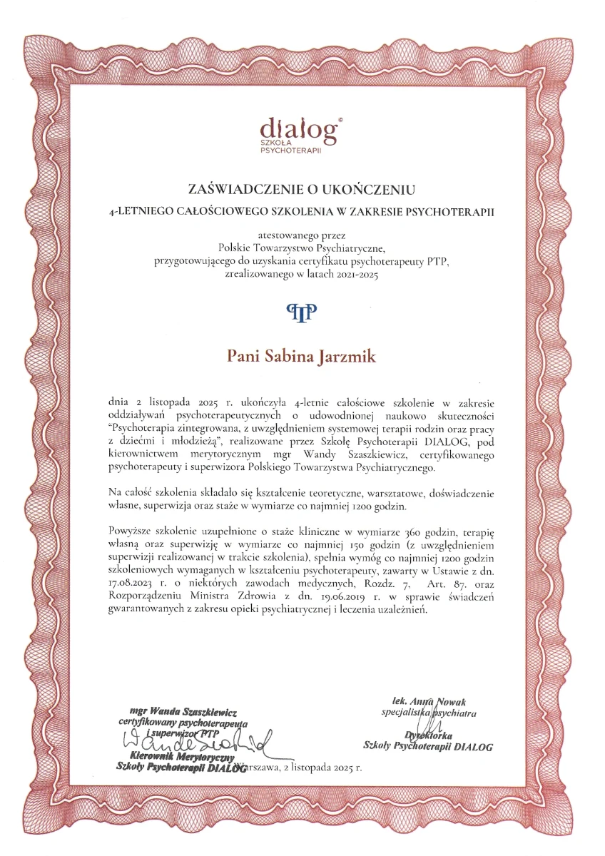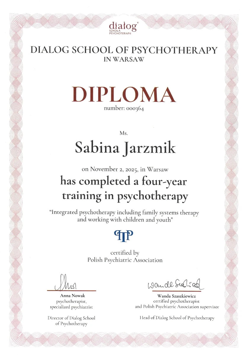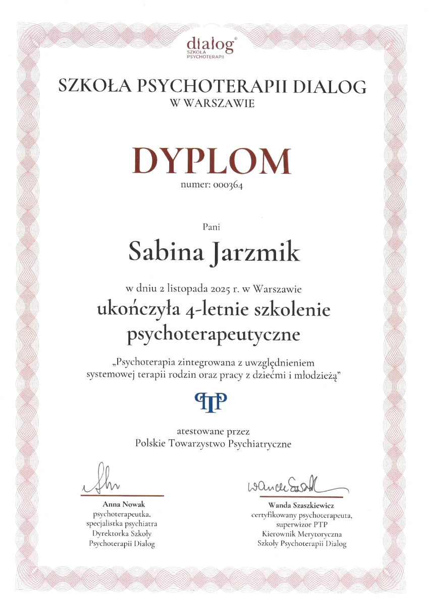 Systematycznie poszerzam swoją wiedzą biorąc udział w szkoleniach, konferencjach naukowych oraz webinarach. Od 2021 roku należę do Polskiego Towarzystwa Psychiatrycznego oraz Polskiego Stowarzyszenia Terapeutów Terapii Skoncentrowanej na Rozwiązaniach.